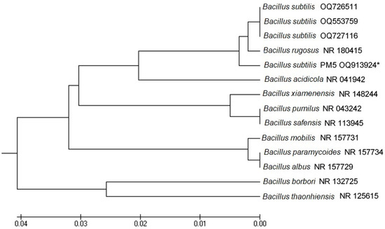 The isolates were characterized based on being Gram-positive, catalase-negative rods and then identified based on the 16S rRNA genes. The obtained sequences showed similarity with those of known species available in the NCBI database (Figure 4). 16S rDNA sequences were submitted to GenBank, and the accession number for PM5 (B. subtilis) (OQ913924) was 99% similar to that for B. subtilis (ON668232). The phylogenetic tree of the neighbor-joining method showed that B. subtilis was 0.001 bootstrap closer to Bacillus species.