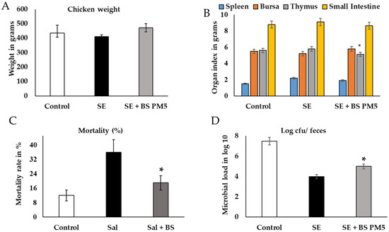 Using a chicken model, the probiotic isolate (B. subtilis PM5) was tested for in vivo probiotic properties on chicken immune health. The results showed that the effects of B. subtilis PM5 on chicken development performance, oxidative stress, and inflammatory cytokines are presented in Figure 5 and Figure 6. When PM5 was supplemented with a chicken feed containing 109 CFU/kg, the mortality of the infected chicken was at a higher rate in S. enterica challenged groups than B. subtilis PM5-fed chicken (p < 0.05). Chickens fed with B. subtilis PM5 gained weight, increasing from 427 g to 477 g, and had lower death rates (17 to 34%) (Figure 5). After 4 weeks, significant macroscopic differences in liver tissue color and morphology were observed between S. enterica-infected chickens fed with B. subtilis PM5 and the control group.