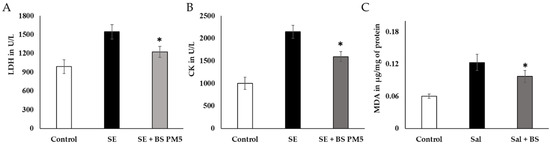 There was a significant decrease in serum LDH and CK levels. (p < 0.05) in the B. subtilis PM5-fed group compared to the disease group (Figure 6A,B). MDA, a neutrophil infiltration marker, was found to be considerably higher in the liver tissues of the S. enterica-infected group. In contrast, with S. enterica administration, B. subtilis PM5-fed hens displayed increased oxidative stress activities (p < 0.05) and lower MDA levels (p < 0.05) in the illness group (Figure 6C).