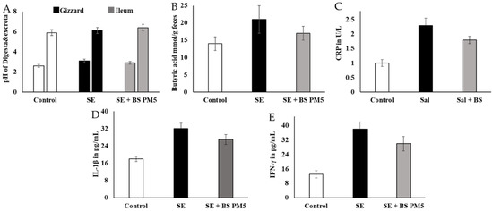 The influence of PM6 supplementation on the inflammatory response of chickens challenged with S. enterica. (A) pH estimation of different intestinal content (Gizzard and ileum) food content at 20th days of the experiment. (B) Estimation of butyric acid levels in the mucus of S. enterica-challenged chicken colon and PM5 treatment groups. (C) Lymphocyte degradation marker CRP was quantified in the serum samples. (D) IL-1β inflammatory cytokine concentration in S. enterica-challenged chicken serum and PM5 treatment groups. (E) Determination of the IFN-γ content in the serum of S. enterica-challenged chickens and PM5-treated groups as an infection stimulation marker cytokine.