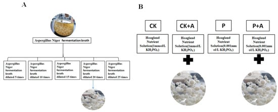 (A) The cell-free AFB stock solution was diluted with distilled water 5 times, 10 times, 15 times, 20 times, and 25 times; (B) Treatment. CK means no AFB under normal phosphorus conditions (1 mmol/L); CK+A: AFB under normal phosphorus conditions (1 mmol/L); P: no AFB under low phosphorus stress (0.001 mmol/L); P+A: AFB was applied under low phosphorus stress (0.001 mmol/L).