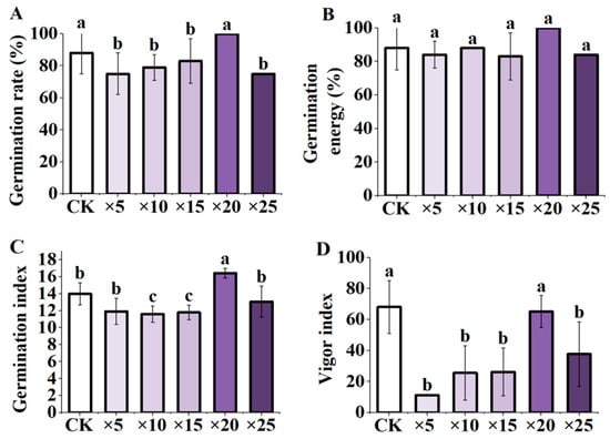 Effects of AFB inoculation on the germination indexes of maize seeds under different dilution ratios. (A) germination rate; (B) germination energy; (C) germination index; (D) vigor index; CK: blank control, soaking seeds in distilled water, ×5: 5-fold dilution of fermentation broth, ×10: 10-fold dilution of fermentation broth, ×15: fermentation broth stock 15-fold dilution, ×20: 20-fold dilution of fermentation broth stock solution, ×25: 25-fold dilution of fermentation broth stock solution. Different letters indicate significant differences (p < 0.05; one-way ANOVA) and bar values indicate mean ± SD values.