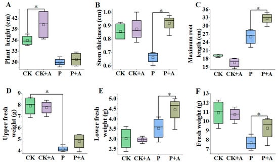 Effects of AFB on plant height (A), stem thickness (B), maximum root length (C), upper fresh weight (D), lower fresh weight (E), and fresh weight (F) of maize seedlings under low phosphorus stress. CK means no AFB under normal phosphorus conditions (1 mmol/L); CK+A: AFB under normal phosphorus conditions (1 mmol/L); P: no AFB under low phosphorus stress (0.001 mmol/L); P+A: AFB was applied under low phosphorus stress (0.001 mmol/L). Asterisks indicate significant differences (p < 0.05; one-way ANOVA) and bar values indicate mean ± SD values.