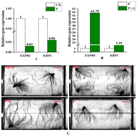 Compared with the control, the expression levels of root-related genes EXPB4 and KRP1 were downregulated under low phosphorus stress (P) (Figure 4A); the expression levels of the two genes were upregulated following the application of AFB under low phosphorus conditions (P+A), especially EXPB4 (Figure 4B).