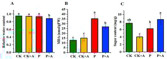 (A) Effects of AFB on the relative water content of maize seedlings under low phosphorus stress; (B) MDA contents; (C) Soluble sugar content. CK means no AFB under normal phosphorus conditions (1 mmol/L); CK+A: AFB under normal phosphorus conditions (1 mmol/L); P: no AFB under low phosphorus stress (0.001 mmol/L); P+A: AFB was applied under low phosphorus stress (0.001 mmol/L). Different letters indicate significant differences (p < 0.05; one-way ANOVA) and bar values indicate mean ± SD values.