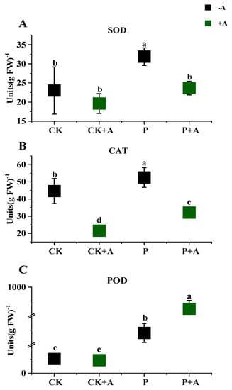 Compared with normal phosphorus conditions, SOD, CAT, and POD activity in maize seedling leaves under low phosphorus stress was significantly increased (p < 0.05) by 8.88 U/gFW, 7.88 U/gFW, and 376 U/gFW, respectively. Under low phosphorus stress, the application of AFB (P+A) resulted in significantly reduced (p < 0.05) SOD and CAT activity in the leaves of maize seedlings by 8.24 U/gFW and 20.39U/gFW. In contrast, POD activity in the leaves of maize seedlings (P+A) was significantly increased (p < 0.05) and increased by 36.3 U/gFW (Figure 6).