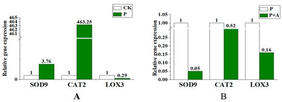 Compared with the control, the expression levels of key antioxidant enzyme genes SOD9 and CAT2 were upregulated, while LOX3, a gene involved in lipid peroxidation, was downregulated under low phosphorus stress (Figure 7A). The expression of SOD9 and CAT2 was downregulated when AFB was applied under low phosphorus conditions (P+A) and the expression of SOD9 and LOX3 was downregulated most obviously (Figure 7B).