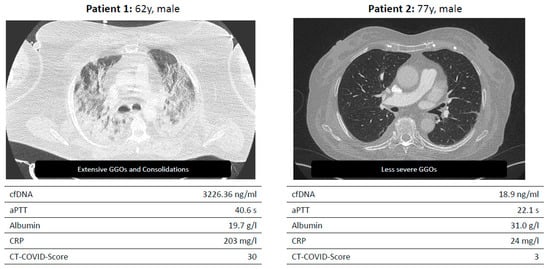 The pandemic spread of severe acute respiratory syndrome coronavirus type 2 (SARS-CoV-2) and the emergence of coronavirus disease 2019 (COVID-19) has had enormous global health and socio-economic consequences and high infectivity as well as hospitalization rates have put hospital bed and Intensive-Care-Unit (ICU) capacities under enormous stress during the first pandemic waves [1]. Accordingly, the rapid identification of disease severity enabling triaging of patients is an essential clinical aspect and requires a multidisciplinary approach to optimize the diagnostic potential. Various routine laboratory parameters associated with disease severity have already been described, but an integrative approach including Radiomics and cfDNA is missing so far. Among those, C-reactive protein (CRP), activated partial thromboplastin time (PTT), D-dimer, and lactate dehydrogenase (LDH) have been reported [2,3,4]. Moreover, previous studies have shown an association between increased cell-free DNA (cfDNA) and a severe course of COVID-19 [5,6]. In this study, we intended to identify suitable markers associated with intensive care requirements. The routine laboratory parameters examined in other studies were further augmented by quantified cfDNA in our work as a dynamic marker of cell decay. Since we anticipated increased cell death of lung tissue, especially in the presence of lung consolidations, this study was called “Laboratory Assessment of Ground Glass Opacities” (LAGGO), emphasizing the interdisciplinary aspect of the work.