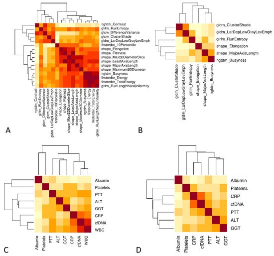 Reduction of collinearity. (A) Correlation plot to identify potential clusters of radiomics. The degree of correlation is classified by the brightness of the colors (dark brown corresponds to a high correlation). (B) Clustering was reduced by the use of a minimal redundancy algorithm. (C) Correlation plot of laboratory parameters. (D) Exclusion of “white blood cells” because of the highest correlation with CRP. (B,D) Variables were included in the final integrative model.