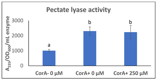 Pectate lyase activity in the presence of CorA inhibitor. CorA− (KD101/pTH19Cr) and CorA+ (KD101/pCKD121) strains of P. versatile were grown in minimal media supplemented with or without CorA inhibitor Co(III)Hex and Pel activity was determined from culture supernatants. Data represent the means of three biological replicates. Letters that are not the same indicate a significant difference where p < 0.05 as determined by a Student’s t-test.
