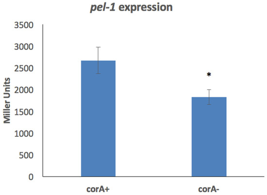 Expression of pel-1 in the absence of corA. KD100/pAKC1203 (CorA+) and KD103/pAKC1203 (CorA−) strains both carrying pel-1 promoter cloned in lacZ reporter plasmid pMP220 were grown in minimal medium and expression of pel-1 was measured by Miller assay. Data represent the average of three biological replicates. * indicates a significant difference where p < 0.05 as determined by a Student’s t-test.