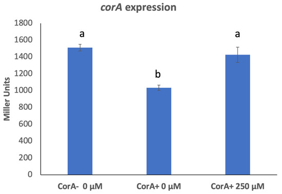 Expression of corA in the presence of CorA inhibitor. CorA− KD101with chromosomal corA-lacZ fusion carrying either cloning vector, pTH19cr or pCKD121 (corA+), were grown in media supplemented with a range of Co(III)Hex concentrations and β-galactosidase activity was determined. Data represent the means of three biological replicates. Letters that are not the same indicate a significant difference where p < 0.05 as determined by a Student’s t-test.