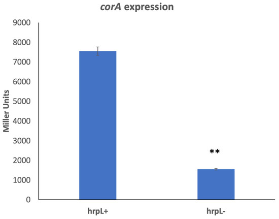 corA expression in the absence of HrpL. P. versatile KD100 (HrpL+) and AC5086 (HrpL−) carrying pCKD120 (cosmid-borne corA-lacZ) were grown in MM supplemented with tetracycline (10 mg/L). The experiment was repeated twice, and each treatment has three replicates. ** indicates a significant difference where p < 0.001 as determined by a Student’s t-test.