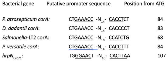 HrpL is a sigma factor that activates the promoters of many genes involved in type III secretion system and pathogenicity [11]. Paramount among these are the hypersensitive response and pathogenicity (hrp) genes, which code for components of type III secretion system as well as harpins and other effectors and avirulence factors [14,45]. The recognition sequences of HrpL sigma factor, termed Hrp box, have been defined at the promoters of its target genes. HrpL recognizes and binds to the consensus sequence GGCCAA-N16-CCACNNA, but variations of the sequence have also been reported [46,47]. As our data demonstrate HrpL regulation of corA expression, we wanted to find out if the regulatory sequences of corA contain a putative hrpL recognition sequence. The upstream sequences of corA from the soft rot Pectobacteriaceae and S. enterica serovar Typhimurium were aligned to search for hrpL promoter-like sequences. The sequence GAAACC -N14-CACCT exists in P. versatile Ecc71, P. atrosepticum SCRI1043, and Dickeya dadantii 3937 and GAAACC-N19-CCANC in S. enterica serovar Typhimurium LT2 and are found approximately 84 and 68 bases away from their respective translational start sites (Figure 6). There is only a slight variation in the putative hrpL promoter sequences in the soft rot Pectobacteriaceae shown in Figure 6 from the previously reported [48] Hrp box promoter sequence found in hrpNEcc with a difference of one base variation (GAAACC instead of GGAACC) in the −35 site and (CACCT instead of CACTT) in the −10 site. The presence of a similar HrpL-regulated promoter sequence flanking corA gives further support that corA could be a component of HrpL regulon in P. versatile.