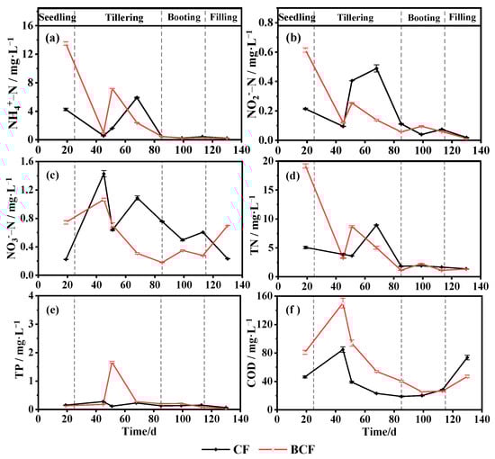 Changes in nutrient concentration in paddy water during the whole growth of rice in CF and BCF treatments. CF, chemical fertilizer, black line; BCF, biogas slurry plus partial chemical fertilizer, red line. (a) ammonium-N, (b) nitrite-N, (c) nitrate-N, (d) TN, (e)TP, (f) COD.