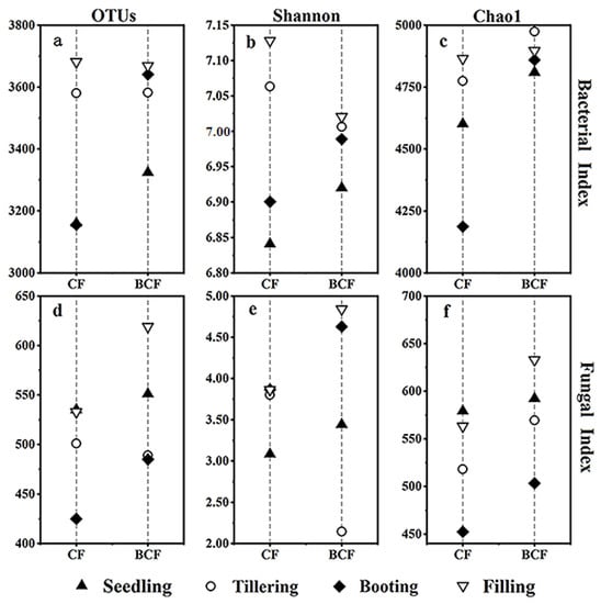 Diversity of the bacterial and fungal communities including OTU number (a,d), Shannon value (b,e), and Chao1 value (c,f) during the whole growth of rice in CF and BCF treatments. CF, chemical fertilizer treatment; BCF, biogas slurry plus partial chemical fertilizer treatment.