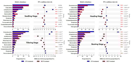 Rhizosphere microbial community structure during the whole growth of rice in CF and BCF treatments. Phyla differences in bacterial composition between these two treatments. Phyla proportions in one treatment have a positive (negative) difference with the other and are indicated by different colors. * p ≤ 0.05, ** p ≤ 0.01,*** p ≤ 0.001.