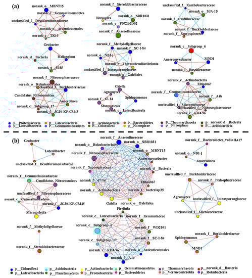Additionally, correlation analysis of the predominant genera was also performed at the four rice growth stages of BCF (Figure 4a) and CF (Figure 4b) to ascertain their coupling relationship. The co-occurrence networks in the BCF and CF treatments consisted of 88 nodes with 339 edges and 94 nodes with 183 edges, respectively (Figure 4). Comparatively, the bacterial network in BCF treatment was more complex and showed a closer correlation of N-, P-, and C-cycling-related microbes. In particular, the dominant Proteobacteria, Actinobacteria, Thaumarchaeota, and Ascomycota were highly positively correlated in BCF treatment, as evidenced by the intertwined red wide connection lines (Figure 4b). It was noted that organic matter degradation-related Marmoricola and Gaiella [8] were correlated with the N-cycling-related genus Nitrososphaeraceae [20] in BCF.