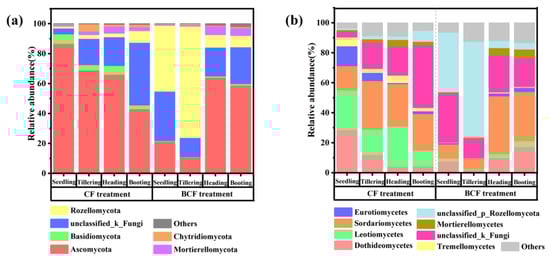 The main phyla of fungi in CF and BCF were Ascomycota, Basidiomycota, Rozellomycota, Mortierellomycota, and Chytridiomycota (Figure 5a). Comparatively, the relative abundance of the predominated fungal phylum was Ascomycota in CF, which decreased from 86.70% to 43.09% during rice growth. However, Ascomycota was only dominant in the booting stage (64.14%) and grain-filling stage (58.86%) in BCF, and their corresponding relative abundances of Ascomycota were higher than those in CF. The Ascomycota-like Dothideomycetes and Sordariomycetes were found to be the dominant fungi class at booting and filling stages in BCF (Figure 5b).