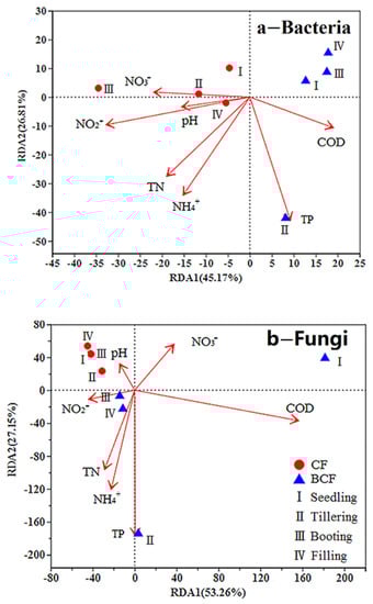 The redundancy analysis (RDA) was performed to reveal the relationships of dominant bacterial and fungal community compositions with the environmental factors (TN, NH4+, NO2−, NO3−, TP, COD, pH of paddy water) (Figure 6). The RDA profile showed that the first two axes explained 71.98% and 80.41% of the total variations of the bacterial and fungal community differences, respectively. It was found that the bacteria in the BCF were negatively correlated with NO3− at different growth stages and positively correlated with TP at the tillering stage, whereas the bacteria in the CF were positively correlated with NO3− and negatively correlated with TP at different growth stages. It was worth noting that TP in the paddy water of BCF was most correlated to the rhizosphere bacterial community structures (R2 = 0.8946, p < 0.05), while COD in the paddy water was the most important factor in shaping the fungal community (R2 = 0.8794, p < 0.05).