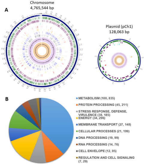 However, contrary to these adverse traits reported in the Kosakonia genus, in recent decades the increased characterization of microbiomes associated with plants and the isolation of beneficial microorganisms as inoculants to ensure crop yield and nutritional quality have allowed for the isolation of several strains of the Kosakonia genus as a plant growth-promoting rhizobacteria (PGPR), conferring upon plants the ability to tolerate abiotic stress [10,11] or as a biocontrol of phytopathogenic fungi [12]. Interestingly, one report showed that K. cowanii colonizing the gut of Anopheles gambiae displayed direct anti-Plasmodium properties [13]; therefore, these findings revealed that many metabolic features of the Kosakonia genus still remain unexplored [10]. Previous efforts to determine the bacterial diversity in Mexican chili powder [14] led us to detect the presence of K. cowanii by 16S rDNA Illumina sequencing, and several bacterial isolates were obtained. In this work, we present the results of the characterization of a new K. cowanii Ch1 strain through genome sequencing and phytopathogenicity testing in Capsicum annuum L. More importantly, we identify for the first time its ability to inhibit phytopathogenic fungi growth by volatile organic compounds (VOCs). K. cowanii Ch1 exhibits important biocontrol activity and could be a promising element for the biocontrol of economically important phytopathogenic microorganisms.