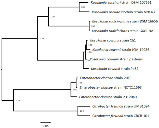 Phylogenetic tree analysis of K. cowanii Ch1. The Codon Tree pipeline of BV-BRC was used to generate bacterial phylogenetic trees with Kosakonia genus strains (see methodology). Enterobacter cloacae and Citrobacter freundi were selected as outgroups.