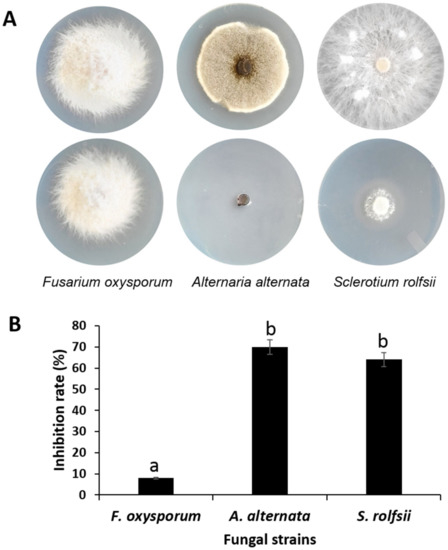 The following fungal pathogens were selected to test the inhibitory effects of K. cowanii Ch1 volatile organic compounds (VOCs): Alternaria alternata, which causes black spot in diverse fruits and vegetables around the world; Fusarium oxysporum, with diverse members of this species causing complex infections on economically relevant crops worldwide with typical symptoms such as chlorosis, necrosis of vascular systems, and potential death of colonized plants; and Sclerotium rolfsii, which is a very common soil-borne fungus infecting a wide range of vegetable, ornamental, and field crops. These fungal strains were provided by the Laboratory of Plants and Agriculture Biotechnology at Queretaro University, Mexico. The fungal strains were grown in potato dextrose agar (PDA) medium (Difco Laboratories, Detroit, MI, USA) and incubated at 28 °C for 7 days prior to use.