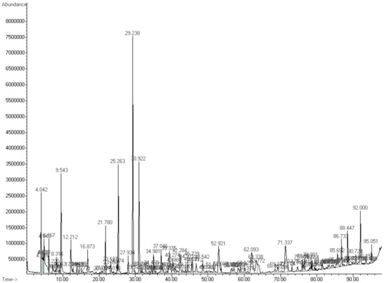 To explore the fungal inhibition rate of VOCs produced by K. cowanii Ch1 during different fermentation times, filtrate cell free (FCF) values were obtained every 6 h for a 48 h period. The results showed that the FCF values at 18 h exhibited the highest mean inhibition rate against A. alternata, with a mean rate of 60%, while the FCF values at 12 h had only a mean rate of fungal inhibition of 20%; the FCF results from other fermentation times showed no significant inhibition. Therefore, we decided to analyze the VOCs from the fermentation time at 18 h using HS–SPME–GC–MS (Figure 5).