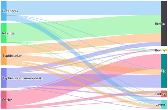 Sankey diagram showing the distribution of the most important European Salmonella serovars involved in human salmonellosis cases, reported from specified food-animal categories, by food-animal source in 2021. According to the EFSA report, animal and food data from the same source were merged: ‘broiler’ includes isolates from broiler flocks and broiler meat, ‘bovine’ includes isolates from bovines for meat production and from bovine meat, ‘pig’ includes isolates from fattening pigs and pig meat, ‘turkey’ includes isolates from fattening turkey flocks and turkey meat and ‘layers’ includes isolates from laying hen flocks and eggs. The width of the coloured bands linking the sources and serovars is proportional to the percentage of isolates of each serovar from each source. Obtained from: EFSA and ECDC, 2022 [15].
