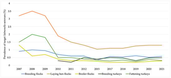 The evolution of the prevalence of target Salmonella serovars in the European poultry production sector. Data obtained from the European Food Safety Authority reports [6,15,23,24,25,26,27,28,29,30,31,32].