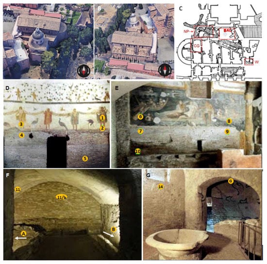 Roman houses of the Caelian Hill. (A) Aerial view, Northern side, (B) Aerial view, Southern side; (C) Site map, in red, are the four rooms under study and after the pictures of them as they were during the early 2000s: (D) Chamber of Geniuses (CG), (E) Nymphaeum of Proserpine (NP), (F) The Winery, (W), and (G) The “Balneum” the white arrows indicate the A and B walls where sampling was performed (BAL). Within yellow are the sampling points used by Bartolini and colleagues [22,23].