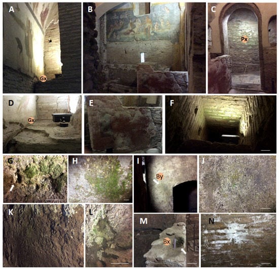 Deterioration patterns recorded and additional sampling points. (A,D) GC, niche—additional sampling point; (B,E) NP, lower wall–additional sample; (C) Light green opaque patina at the NP side chamber; (F) Lampenflora example along the visit path; (G,H) Winery deterioration pattern recorded on the A wall; the white arrow indicates a exfoliating flake from the wall (K,L) Winery-deterioration pattern recorded on the B wall characterized by a brown patina in the lower shaded part (K) and a green one close to the light (L); (I,J,M,N) Balneum: (I,J) Illuminated wall, By sampling site, and magnification of the yellow–green discoloration pattern; (M) Greenish colonized lower wall from where Bx sample was extracted, (L) Whitish patina on the non-irradiated lobby wall. Bar is equal to 10 cm.