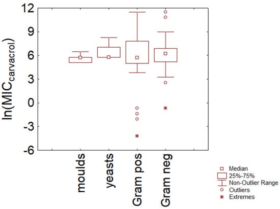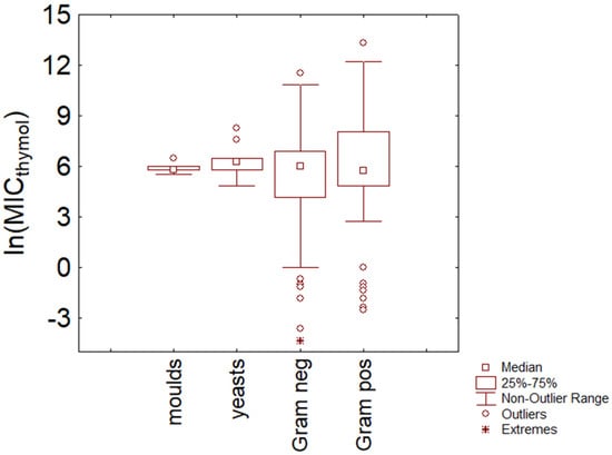 As a rationale, this paper focuses on two representative compounds, thymol and carvacrol, with a well-defined chemical structure, and whose chemistry is well known to avoid any confounding effect related to EO composition. They have a core phenolic ring in their moieties, and an OH-secondary group, although in different positions, similar densities, and boiling points (0.969 vs. 0.973 mg/L for the density and 233 °C vs. 237 °C for the boiling points) [11,14]. The choice of isomers with similar properties also avoids the cofounding effect related to chemistry. In the following sections, each compound is separately analyzed using non-parametric tests and box plot graphs; namely, the MIC values were analyzed according to different categories. First, the analysis was conducted using Gram-positive or Gram-negative bacteria, yeasts, and molds as predictors. Then, a focus was conducted within Gram-positive or Gram-negative bacteria to point out similarities or dissimilarities. For each category, some representative species were chosen, that is, species for which a high number of MIC values were found in the literature. For this approach, box plot figures were built using the interquartile range for the box and the median as the central point, thus showing the MIC range of thymol and carvacrol for 50% of the strains/species analyzed for each group; moreover, whisker was conducted with theoretical minimum and maximum values, that is, excluding the outliers, thus pointing out the possible range inside which MIC values could be considered typical of the species.