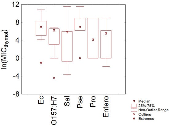 Minimal Inhibitory Concentration (MIC) of thymol (reported as natural logarithm of actual amounts in mg/L) toward Gram-negative bacteria. Ec, E. coli; O157, E. coli O157:H7; Sal, Salmonella sp.; Pse, Pseudomonas spp.; Pro, Proteus spp.; Entero, other enterobacteria.