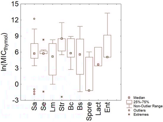 The last analysis conducted for thymol was on Gram-positive bacteria (Figure 3); most data were found for Staphylococcus spp. (S. aureus and S. epidermidis) and streptococci. The plot points out the different trends for the two species of the genus Staphylococcus, as S. epidermidis showed a lower variability in MIC distribution (median 5.73 ln (mg/L), and interquartile range 5.73–6.2 ln (mg/L), corresponding to actual values of 308–493 mg/L). In the case of S. aureus, although the median was similar (5.73 ln (mg/L)), the MIC distribution was characterized by higher variability, as one could infer from the interquartile range (4.85–7.60 ln (mg/L), that is, 128–2000 mg/L) and minimum and maximum of the distribution (3.2–10.7 ln (mg/L)).