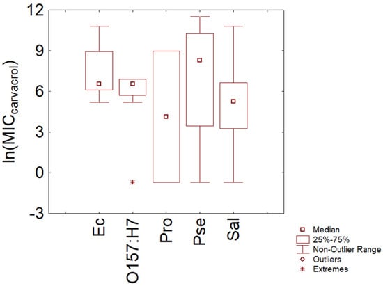 Minimal Inhibitory Concentration (MIC) of carvacrol (reported as natural logarithm of actual amounts in mg/L) toward some Gram-negative bacteria. Ec, E. coli; O157:H7, E. coli O157:H7; Pro, Proteus spp.; Pse, Pseudomonas spp.; Sal, Salmonella sp.