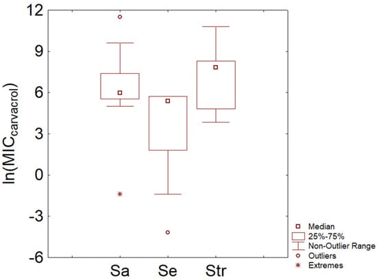 Minimal Inhibitory Concentration (MIC) of carvacrol (reported as natural logarithm of actual amounts in mg/L) toward some Gram-positive bacteria. Sa, S. aureus; Se, S. epidermidis; Str, streptococci.