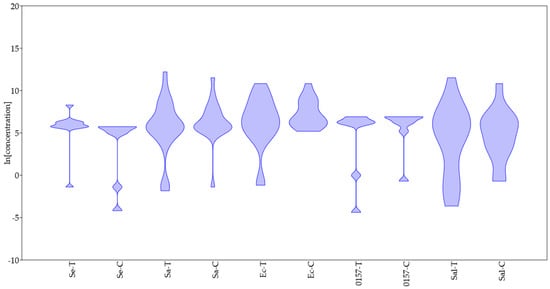 A high variability was also found for Salmonella sp.; the first and third quartiles for this species were 0.69 and 5.99 ln (mg/L) (corresponding to actual values ranging from 0.5 to 400 ppm), while the extremes of the statistical distribution were set at −3.9 and 11.6 ln (mg/L).