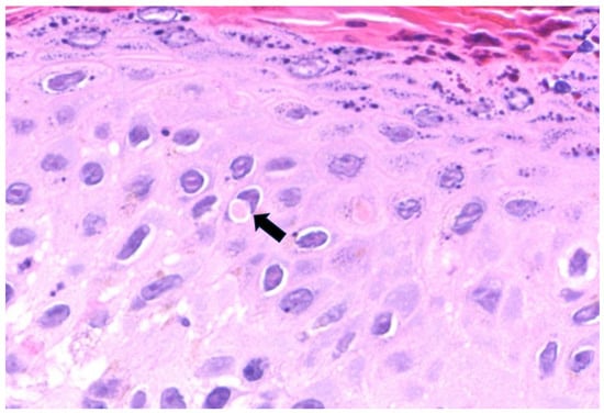Overall, regarding major cytopathic modifications, balloon cell degeneration of keratinocytes (Figure 3) was present in half of the cases. Guarnieri bodies, which are eosinophilic homogeneous intracytoplasmic inclusions (Figure 4), were seen in five patients. Keratinocytes showing eosinophilic “ground glass” nuclei appearance within the central area of the nucleus and chromatin margination giving a basophilic “halo” (Figure 5) were detected in two patients. Occasional multinucleated keratinocytes (Figure 3) were also present in one out of six patients.