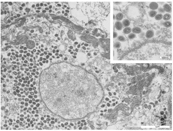 In two cases, mature and immature viruses were also detected, although at low abundance, in the cytoplasm of mesenchymal cells, as previously observed in studies conducted on a cynomolgus macaque model of aerosolized MPXV infection [20].