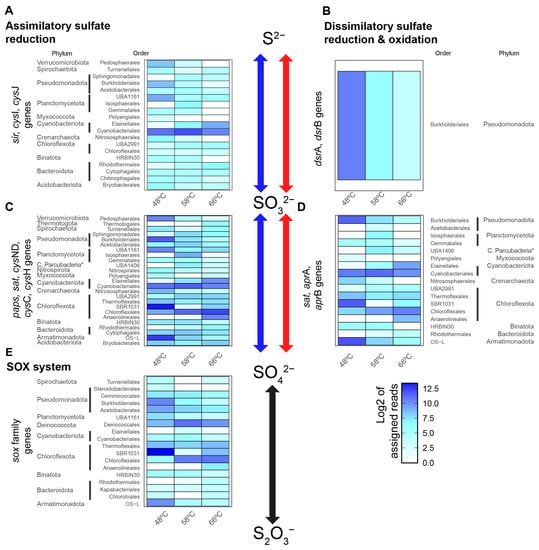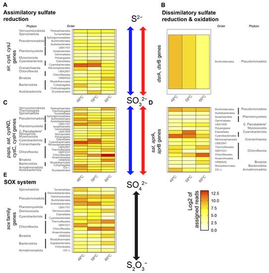 Abundance of sulfur metabolism genes in Porcelana hot spring metagenomes. Genes from the sulfur cycle are grouped based on the pathway ((A,C) for ASR; (B,D) for DSR; and (E) for Sox) and at which step of the sulfur cycle reaction they are involved ((A,B) for sulfide to sulfite; (C,D) for sulfite to sulfate; (E) for sulfate to thiosulfate). Orders with their respective phyla are shown on the Y-axis and samples are shown on the X-axis. The reads counts are normalized by quantiles and Log2-transformed for metagenomes from the three sampled temperatures (48, 58, and 66 °C). Analyzed genes are listed in Table S3. * C denote “Candidatus”.