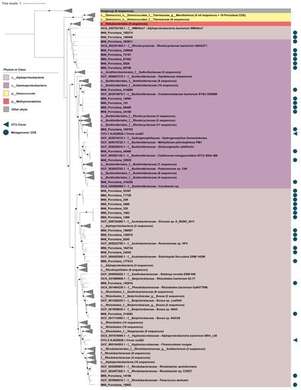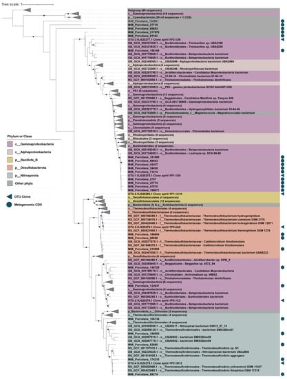 Sequences corresponding to the aprA (TIGRFAM accession: TIGR02061) and soxB (TIGRFAM accession: TIGR04486) genes were extracted using the hmmsearch tool of the HMMER (v3.2.1) software (http://hmmer.org/, accessed in November 2018) from the gene set predicted from the MAGs and unbinned contigs assembled from the three Porcelana metagenomes. The obtained sequences were checked against the nr and refseq_protein databases to confirm annotations, avoiding the recruitment of other protein sequences with shared domains. Taxonomic assignment of the soxB and aprA genes from the cloned OTUs produced in this study and the three metagenomic samples was performed by the closest BLASTP match against the GTDB R95 custom protein database []. The aprA and soxB gene sequences from clones and metagenomes, as well as their closest references, were then aligned using MUSCLE (v6.0.98) software []. Maximum-likelihood trees were generated with the Iqtree (v.1.5.5) software, using the TESTNEW option to choose the best substitution model and the non-parametric ultrafast bootstrap option with 10,000 replicates []. Phylogenetic reconstructions, node collapse, and tree rooting were managed with the iTOL web server [].