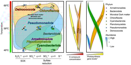 Graphical summary of the microbial community associated with the sulfur cycle at the Porcelana hot spring. In the left panel, a dot plot was built using the gene counts of each sulfur pathway (Table S4) for 8 different phyla and sulfur cycle steps. The size of the colored circle denotes abundance, and the color denotes the respective phylum. Temperature is shown on the Y-axis and sulfur cycle steps on the X-axis. The phylum names are written on the Y-axis, represented as a function of temperature and the sulfur cycle step where they appeared most relevant. The colored area denoting the most relevant Porcelana sulfur-associated bacteria (Pseudomonadota, Chloroflexota, and Cyanobacteriota) was hand-drawn behind the dots. In the central panel, concentrations of three sulfur species are shown based on field-measured concentrations (Table S2). In the right panel, the abundance level of photosynthesis-associated genes the of phyla Cyanobacteria, Chloroflexota, and Pseudomonadota. Temperature is shown on the Y-axis and concentration on the X-axis. * Based on data obtained from Alcamán-Arias et al. [].