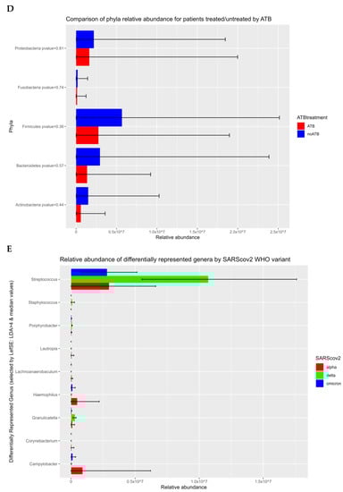 The microbiome fraction or simply the number of reads matching sequences from the standard Kraken2 database, distribution, and representation of bacterial taxa were different across all four groups. The relative abundance of bacteria according to mapped sequence reads was significantly higher in asymptomatic and mild patients. Firmicutes, Bacteroidetes, Proteobacteria, Actinobacteria, and Fusobacteriales were the most abundant phyla among the positives. On the contrary, in the control group, Actinobacteria, Proteobacteria, and Firmicutes were the most abundant group while Bacteroides and Fusobacteriales had only a negligible proportion (Figure 1A–D; Figure 2A,B). Using a threshold of 1000 reads in at least one sample, we identified a total of 944 species, 531 genera, 218 families, 110 orders, 28 classes, and 25 phyla. The highest number of species was in the severe (725), asymptomatic (692), mild (574), and less than tenfold lower numbers in the negative control group (58). It is important to mention that 20 out of 30 severe patients from two hospitals, including 100% of patients from Ruzinov Hospital (18/18) and 16.7% of patients (2/12) from Kramare Hospital, were treated with antibiotics. Antibiotic treatment (ATB) resulted in a reduction of the total bacterial count, but the ratio of individual bacterial taxa was nevertheless maintained (Figure 2C). Although we observed a decrease in the abundance of major bacterial taxa in severe antibiotic users and non-users, this difference was not statistically significant (Figure 2D). Apart from researching bacterial content, we compared relative counts of taxa transcripts between different disease symptoms and different SARS-CoV-2 variants (alpha, delta, omicron) by LefSE tool. Here, we are showing differentially represented genera under the LDA threshold, further filtered by median values (Figure 2E).