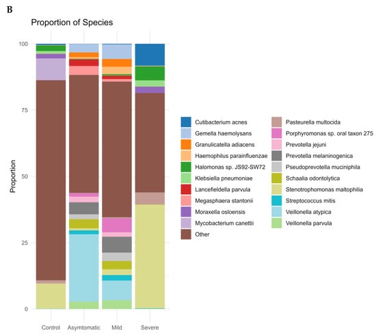 The division into two groups of COVID-positive mild and asymptomatic was motivated by the objective to investigate whether there is any difference between the microbiome of people with symptoms of respiratory disease such as rhinitis, fever, cough and people who, although infected (RT-PCR positive), do not show any symptoms. Our results indicate that both the abundance of bacteria and the proportions of representation of each taxon are very similar in both groups. Although the median Ct values in mild (24.89) and asymptomatic (28.56) appeared to be rather different, they were not statistically significant (Wilcoxon test, p = 0.017), the size of both groups (25 vs. 24), and age distribution (37 vs. 42) were otherwise similar. We did not observe any significant differences at the genus and species level, as confirmed by the statistical analysis (PERMANOVA; p = 0.053 and 0.024, calculated cut-off p-value was 0.0023). The most enriched genera in both groups were Streptococcus, Veillonella (both phyla Firmicutes), and Prevotella (phyla Bacteroidetes) with Veillonella atypica and Prevotella melaninogenica being the most abundant species (bacterial species and genus (Figure 3B)). This observation is consistent with findings from similar studies of the microbiome of upper respiratory airways [34,35,36]. P. melaninogenica is a Gram-negative, obligate anaerobic coccobacillus that can act as an opportunistic pathogen, and there are conflicting hypotheses for its effect on the respiratory tract. For example, P. melaninogenica has been found to be a “beneficial” member of the airway microbiome because it enhances protection against bacterial pneumonia caused mainly by Streptococcus pneumoniae (S. pneumoniae). Further, Prevotella melaninogenica was ranked among the most distinguishing bacterial species separating patients with pneumonia caused by S. pneumoniae (with less P. melaninogenica) from healthy controls (with more P. melaninogenica) [37]. Interestingly, the severe group with acquired pneumonia of unknown bacterial origin had significantly less P. melaninogenica (Figure 3B).
