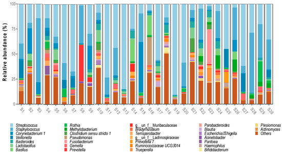 Regarding the bacterial genera, 644 were detected, with the most abundant being Streptococcus spp. (32%), Staphylococcus spp. (17.3%), Corynebacterium spp. (5.1%) and Veillonella spp. (3.1%). Ten genera were identified with a relative abundance between 1.2% and 2.6%, Bacteroides spp. (2.6%), Lactobacillus spp. (2.4%), Bacillus spp. (1.9%), Rothia spp. (1.8%), Methylobacterium spp. (1.6%), Clostridum sensu stricto 1 spp. (1.5%), Pseudomonas spp. (1.4%), Fusobacterium spp. (1.4%), Gemella spp. (1.3%) and Prevotella spp. (1.3%) (Figure 2).