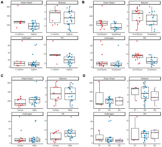 Alpha diversity indices of breast milk microbiota. (A) Type of delivery; (B) Employment relationship; (C) Baby’s gender; (D) Birth weight where G1: birth weight of 2700 g and <3000 g; G2: 3000 g and 3500 g; G3: >3500 g.