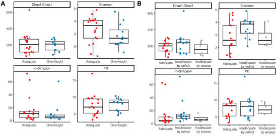 According to the nutritional status by anthropometric indicators, a tendency to have a higher alpha diversity through the Shannon index and InvSimpson index was observed in women with an adequate BMI without statistical differences (Shannon p = 0.22; InvSimpson p = 0.18) (Figure 4A); a lower richness and diversity was also observed in those women who had excessive gestational weight gain (Chao1 p = 0.51; PD p = 0.96) (Figure 4B).