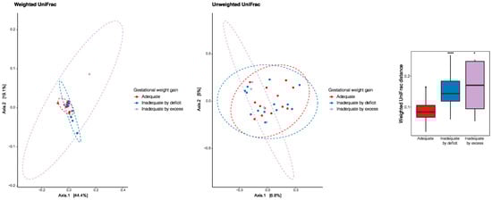 Principal coordinate analysis (PCoA) to identify a clustering pattern of microbial composition based on weighted and unweighted UniFrac distances and according to gestational weight gain. Pairwise beta diversity dissimilarities assessed by Unifrac distances and represented by a boxplot (* p < 0.05, **** p < 0.0001, Reference group = Adequate).