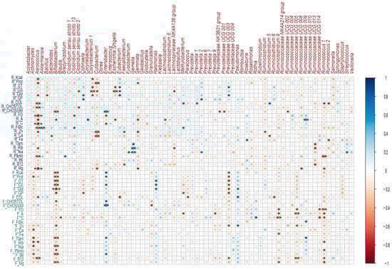 Correlations between breast milk microbial genera and nutrient intake during lactation and gestation. Heatmaps of Spearman rank correlations. Significant correlations (* p < 0.05, ** p ≤ 0.01, *** p ≤ 0.001). Blue circles represent positive correlations, whereas red circles show negative correlations. Note: the letter F and R on the left side of the heat map refers to Food Consumption Frequency and 24 h recall, respectively.